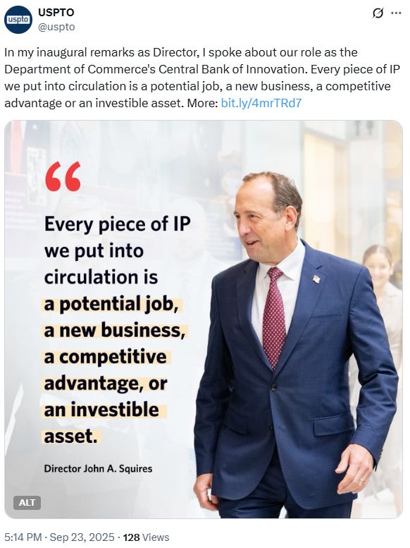 El director Squires también hizo hincapié en el papel crítico de USPTO en la economía nacional. Calificó a la agencia como algo más que un órgano administrativo, llamándolo un brazo estratégico de la política económica nacional y el Banco Central de Innovación del Departamento de Comercio.